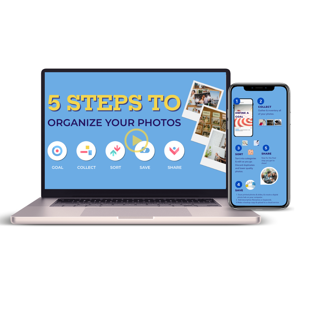 Our FREE 5 Steps to Photo Organizing Tutorial + Guide gives you a clear, realistic starting point, so you can stop spinning and start making progress.